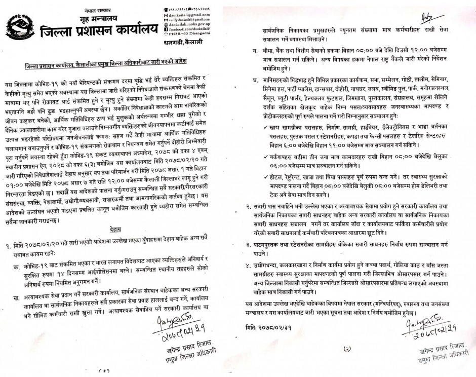 खुकुलाे पार्दै कैलालीमा असार ७ गतेसम्म निषेधाज्ञा थप